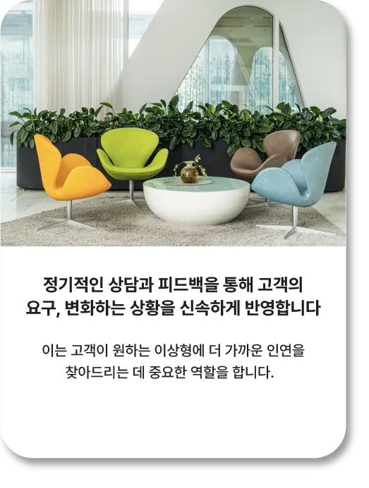 고객의 행복한 결혼 생활을 최우선으로 생각하며, 모든 과정에서 투명하고 신뢰할 수 있는 서비스를 제공하겠습니다.